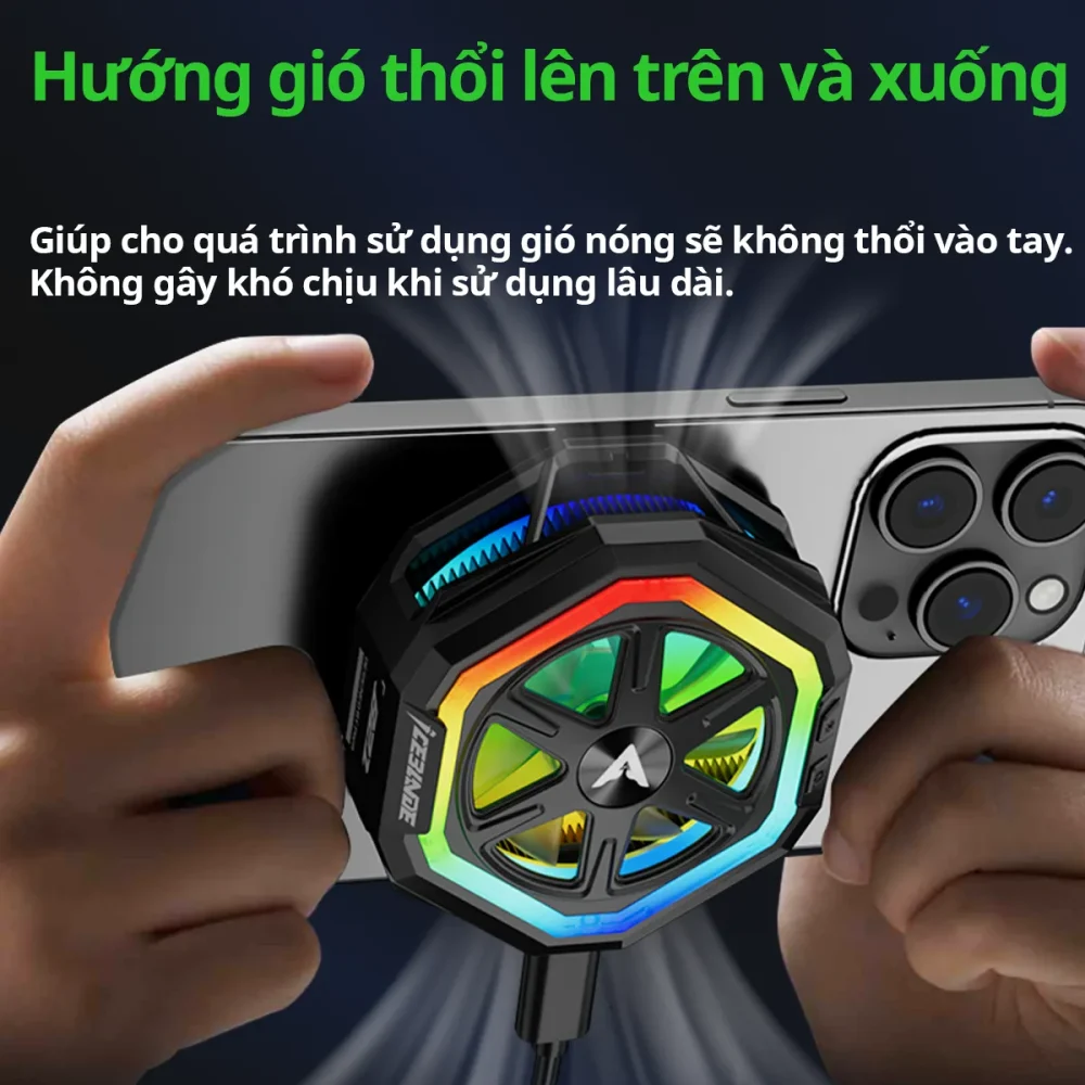 - 🚀 Chế Độ Ép Xung (Cực Lạnh): Giải phóng toàn bộ sức mạnh! Khi “chiến” những tựa game nặng đồ họa cao, gây nóng máy cực độ, chế độ này sẽ đẩy sò lạnh hoạt động ở mức cực lạnh. Tốc độ quạt mặc định là 4200 vòng/phút và có thể tăng lên đến 5200 vòng/phút để đạt hiệu quả làm lạnh tối ưu nhất. (Lưu ý: Cần sử dụng bộ sạc 30W trở lên. Ở chế độ này, quạt sẽ tạo ra tiếng ồn lớn hơn và có thể ảnh hưởng đến tuổi thọ cánh quạt).