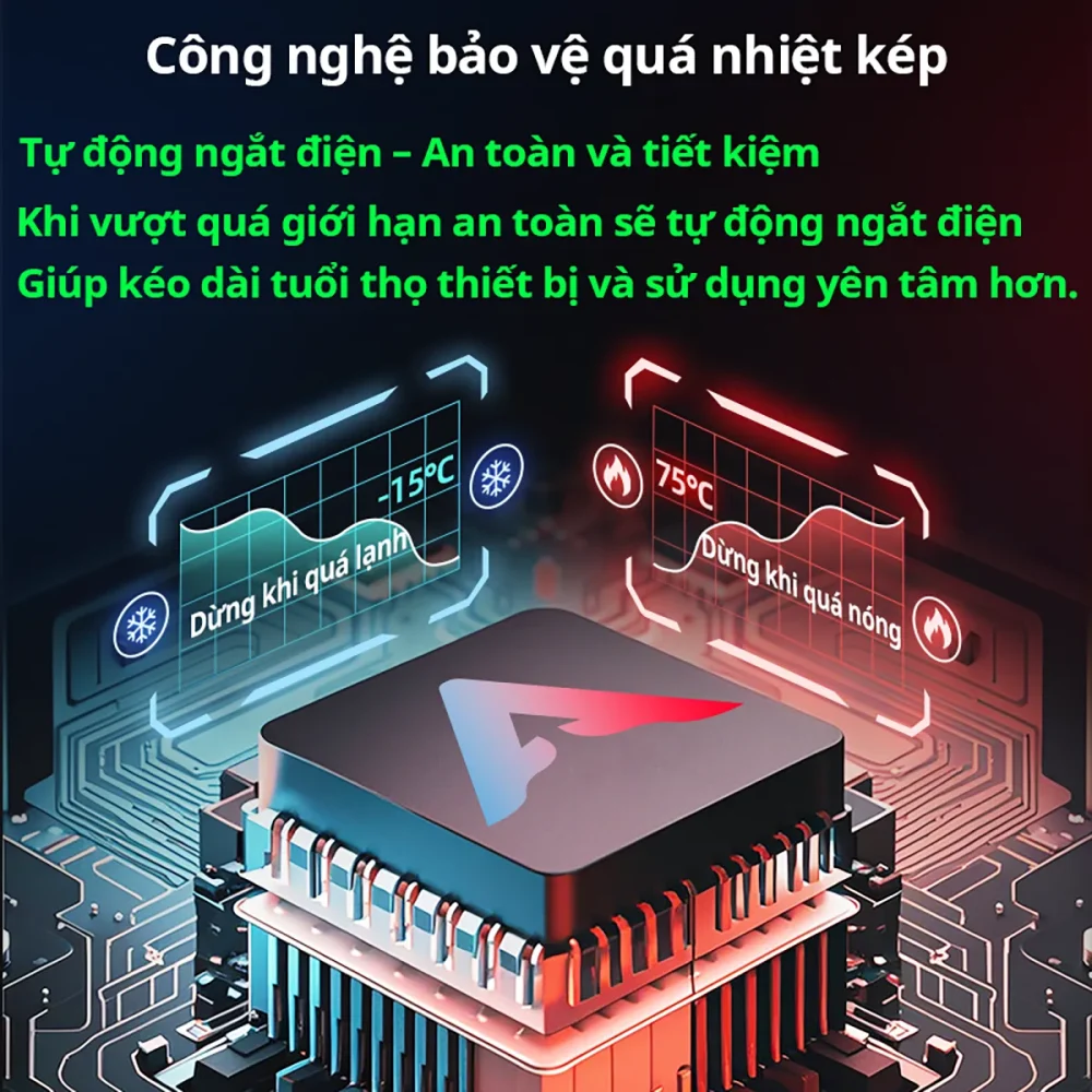 Cảm Biến Thông Minh & Bảo Vệ Quá Nhiệt Kép – An Toàn Tuyệt Đối, An Tâm Sử Dụng!